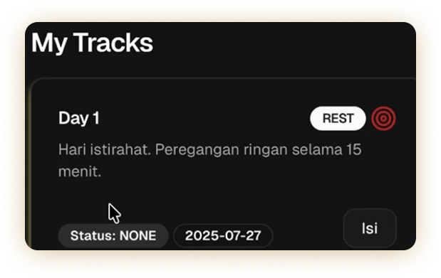 Sistem eksekusi harian yang memastikan semua rutinitas berjalan tepat waktu, terukur, dan bisa dievaluasi secara objektif. Progres dicatat melalui sistem tracking dari berat badan, tidur, hingga pola makan. Tujuannya bukan disiplin sementara, tapi kestabilan jangka panjang yang terukur.